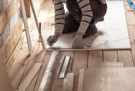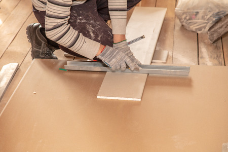 Cut tiles on the floor stacked. Tiles and masonry rugs for laying tiles. Tile workshop