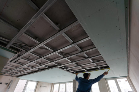 Installation of drywall. Workers are using screws and a screwdriver to attach plasterboard to the ceiling