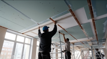 Ceiling installation with expert technicians In the room that is in the construction process.