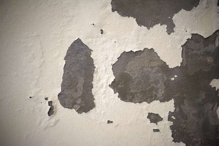 A gray concrete wall with partially collapsed plaster. The surface looks like a geographical map. Background. Texture.