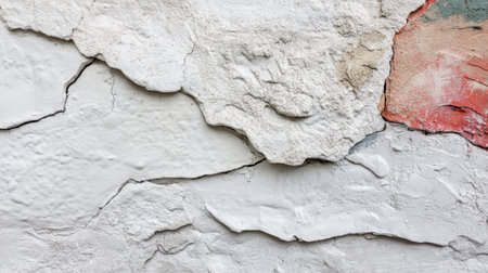 A close-up view of a textured white wall surface featuring cracked plaster, creating unique patterns and an elegant aesthetic ideal for various design and architectural projects.