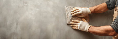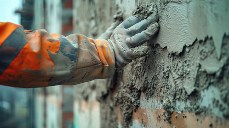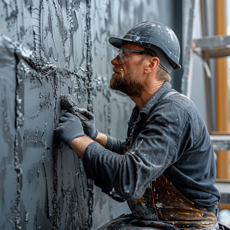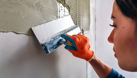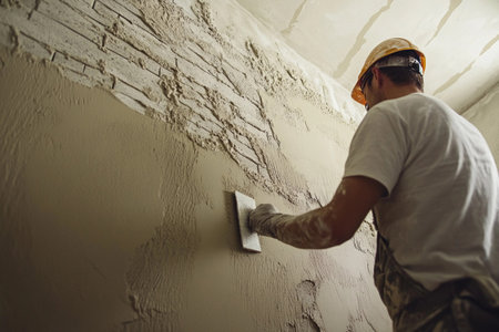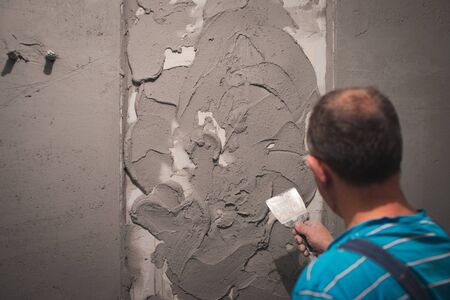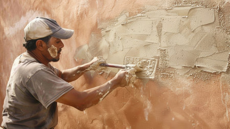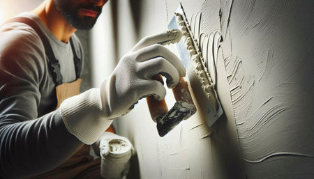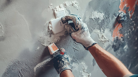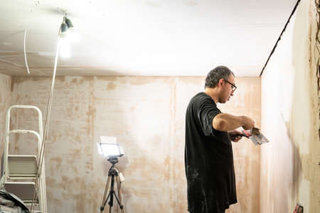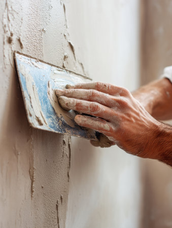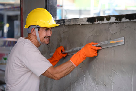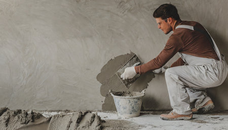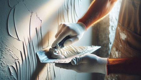 Professional craftsman applying plaster with a trowel, home renovation concept