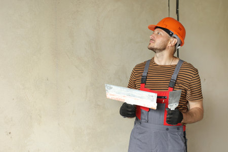 repairman in overalls and protective orange helmet holds two spatulas for plastering concrete wall with putty using. Repair work at apartment and construction new building concept. Copy space.