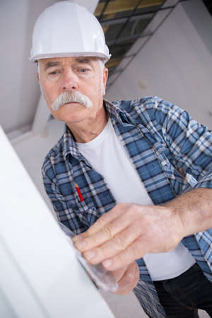 Painter, plasterer, repairman, foreman in helmet or hard hat