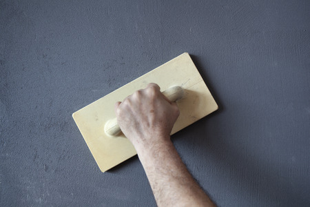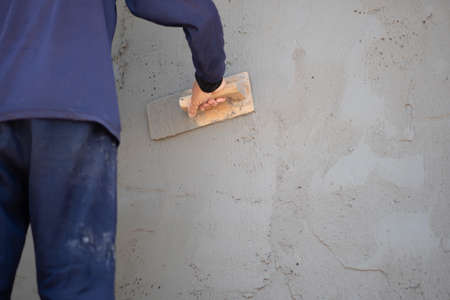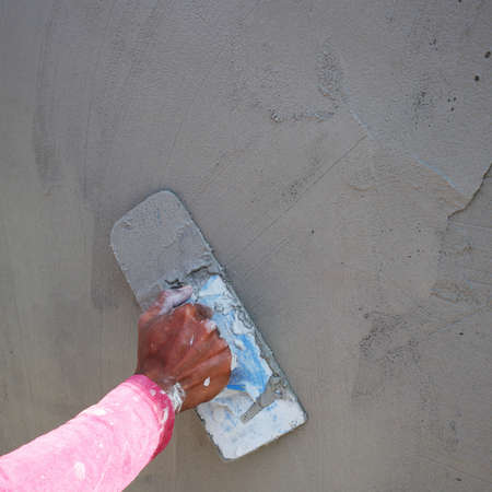 Hand with plastic trowel plastering and smoothing a wet concrete plastered wall.