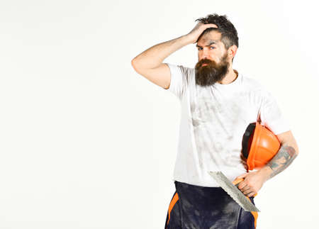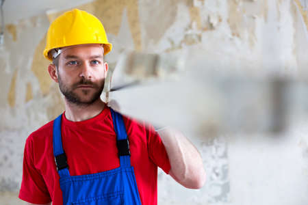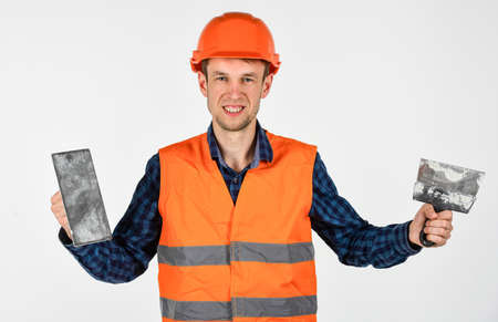 Man plasterer with tools wear protective hard hat, interior design concept