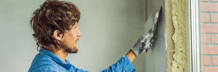 Young man builder dressed in work clothes overall applying putty mortar on the balcony wall with a spatula.