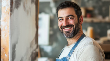 Happy craftsman in workshop showcasing skill and creativity. The man smiles brightly while working with tools, reflecting passion for his trade and dedication.