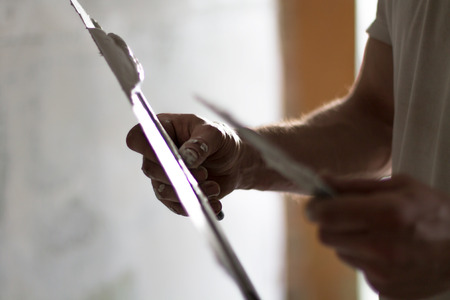 plasterer at indoor wall renovation decoration with palette knife