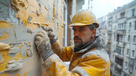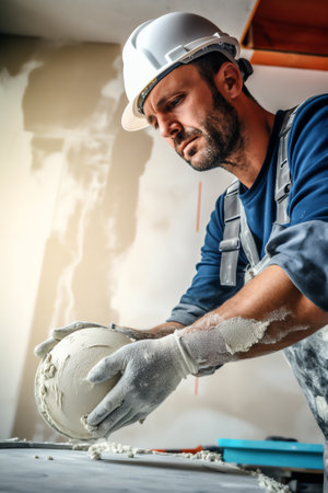 a plasterer meticulously working on a wall, with dust lingering in the air, protected by a mask, offering a raw and authentic glimpse into the construction process