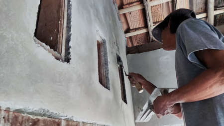 mason rural thailand Plastering concrete to build wall background industrial worker with plastering tools renovating house concept quality