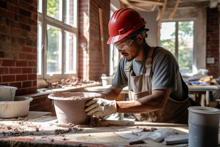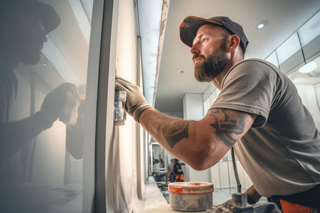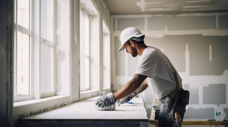 A construction worker applies plaster to a wall in a bright room during sunset, showcasing dedication to home improvement efforts. Generative AI
