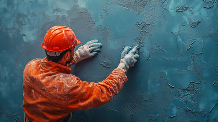 A worker in an orange helmet and gloves carefully applies texture to a freshly painted blue wall at a construction site in the afternoon. The dedication is evident in every gesture.