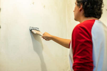 master is applying white putty on a wall and smearing by putty knife in a room of renovating house in daytime