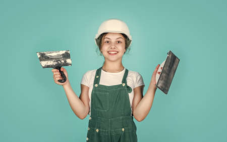 This is my place. kid wear helmet on construction site. teen girl plasterer with tool spatula. child on repairing work. concept of renovation in workshop. busy professional carpenter with trowel