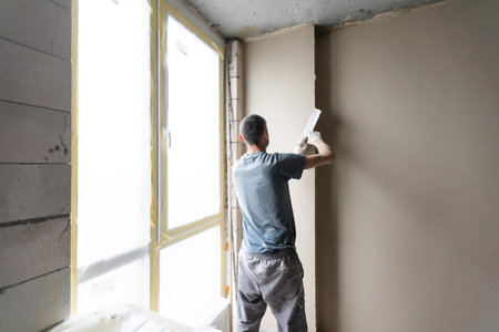 In a cozy interior, a skilled craftsman levels fresh plaster against a wall with a spatula. The focus on detail and technique highlights the craftsmanship involved in home renovation.