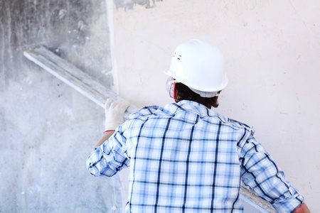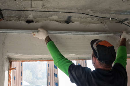 A construction worker plastering a wall with an aluminum rule. Back view. Interior finishing concept