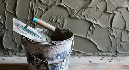 Bucket of cement with trowel and spatula on wooden table