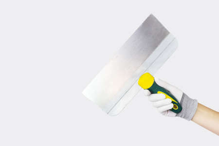 Hand holding putty trowel or food trowel on white background