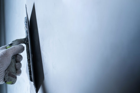Craftsman skillfully applies plaster on a wall using a trowel, creating a smooth texture in a well-lit construction space.