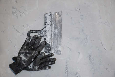 Dirty black work gloves and a spatula lie on the floor. The smooth surface is covered with a light putty. Background. Texture.