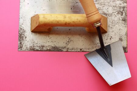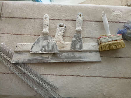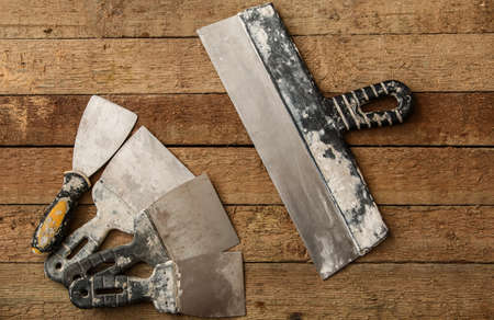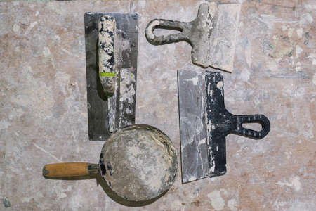 The working tool for plastering and leveling the walls lies on the finishing surface, stained with paint and putty. Background. Texture.