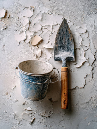 A trowel and a plaster bucket are arranged on a plywood sheet, illuminated by soft light. The peeling surface adds character to the composition.