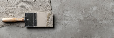 Plastering tools on cement background. View from top. Vertical location.
