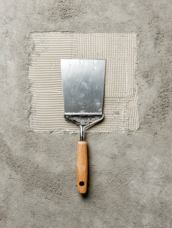 Tile adhesive spatula is placed on a flat concrete surface showing a pattern sample, indicating preparation for tile installation in a construction area.