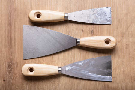 Kit of putty knives over wooden table