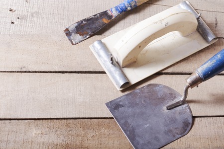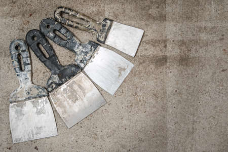 Construction tools on concrete background. Copy space for text. Set of assorted plaster trowel tools and spatula .