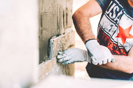 Close Up of professional mason worker indoor - laying tiles on wall at construction site. Industry building concept