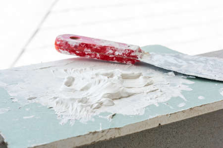 Spatula with putty. The process of applying the paste on the wall