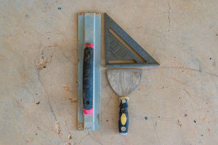 Construction tools background of palette knife, square and gauge on concrete texture background