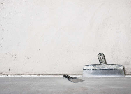 Two trowels wide and medium standing on a concrete floor against a plaster wall. Room renovation concept