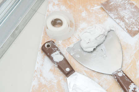 Reinforcing net and instruments over plasterboard surface
