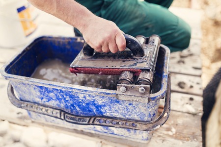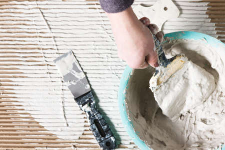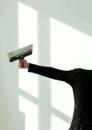 Unrecognizable worker with white plaster, dirty hand with spatula. Construction renovation background with free space for text.
