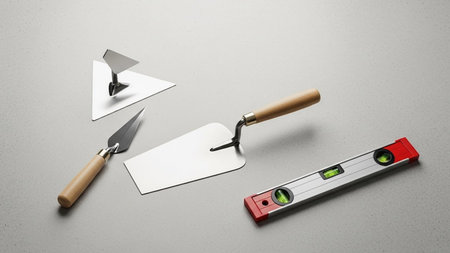 Masonry trowels near a grey plaster wall