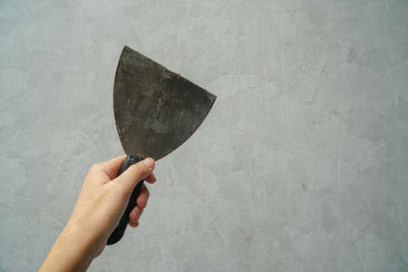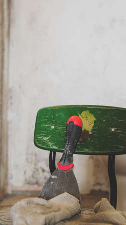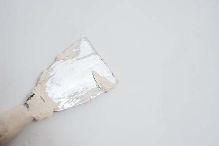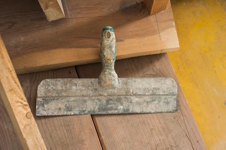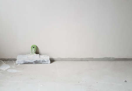 Putty knife in empty room by the wall on cement floor. Room interior.