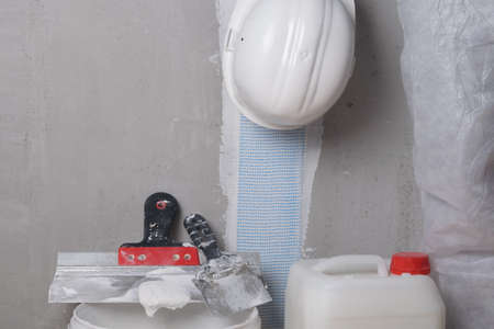 Drywall Patching Tools on the Raw Concrete Background. Construction Tools.