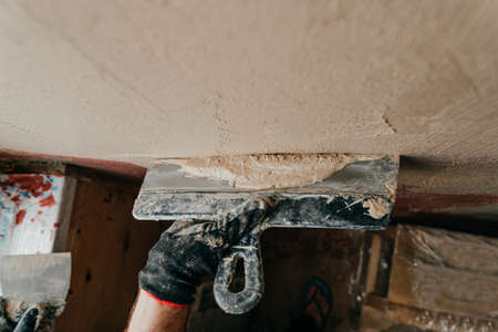 Professional craftsman applying plaster with a trowel, home renovation concept