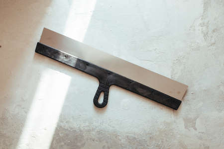 long trowel for wall filling lies on the concrete floor.