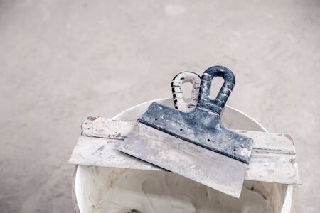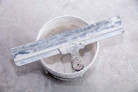 Bucket with putty and putty knife is on the floor room of apartment is under construction, remodeling, renovation, extension, restoration and reconstruction