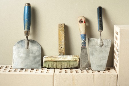 Construction tools in a row and bricks.Building and renovation concept.