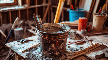 A builder's workspace with a bucket of cement and water, tools scattered around for a renovation project