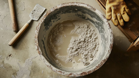 Cement and water in a large mixing tub, with gloves and a trowel placed nearby for construction use