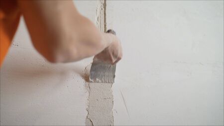 Male hands with spatula using putty for wall, builder making overhaul.