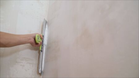 master is applying white putty on a wall and smearing by putty knife in a room of renovating house in daytime.