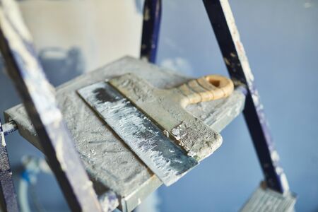 Background image close up of used spatula lying on top of ladder on construction site or in house building, copy space
