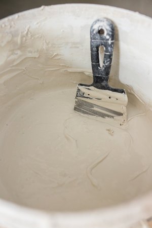 Decorative cement plaster and trowel in construction bucket ready for plastering. Spatula and a bucket of white putty. Top view